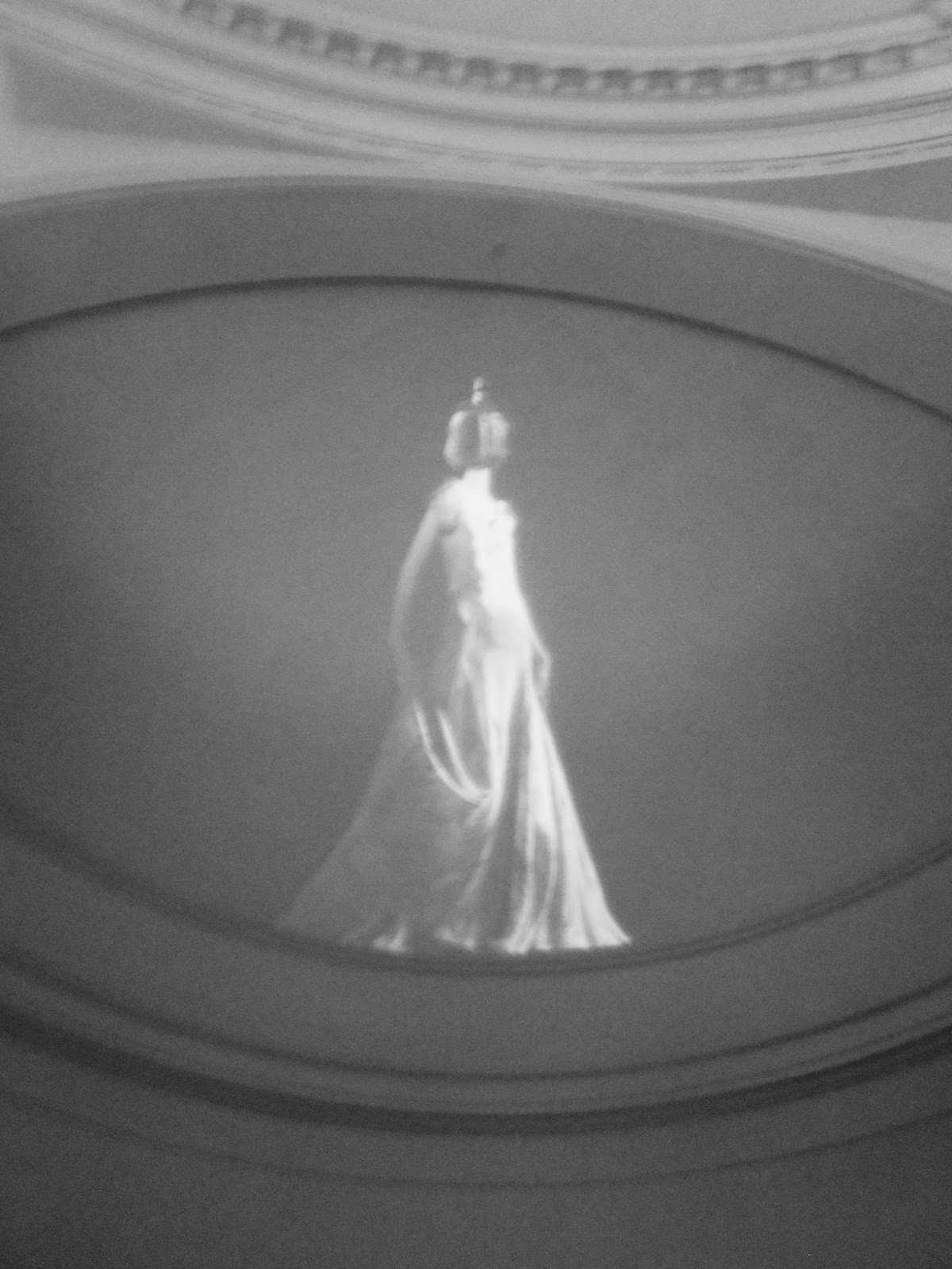 | There was a really cool, giant slide show that was being projected on the ceiling showing different fashions in ethereal black and white. |